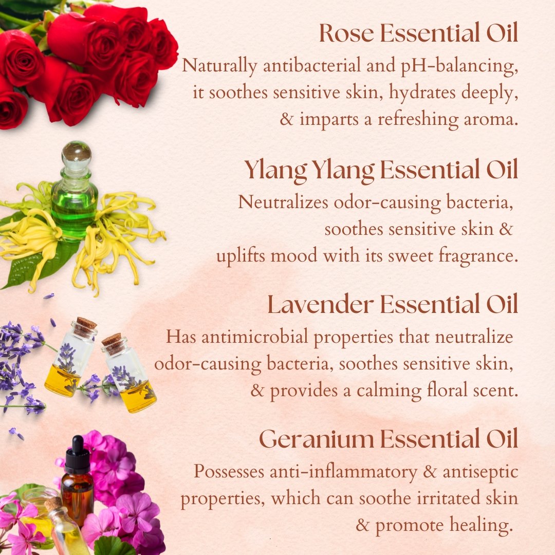 Mild, fresh aroma with floral notes of Rose, Ylang Ylang, Lavender & Geranium. Uplifts mood, relieves anxiety. Reduces stress, eases tension and relaxes the body.